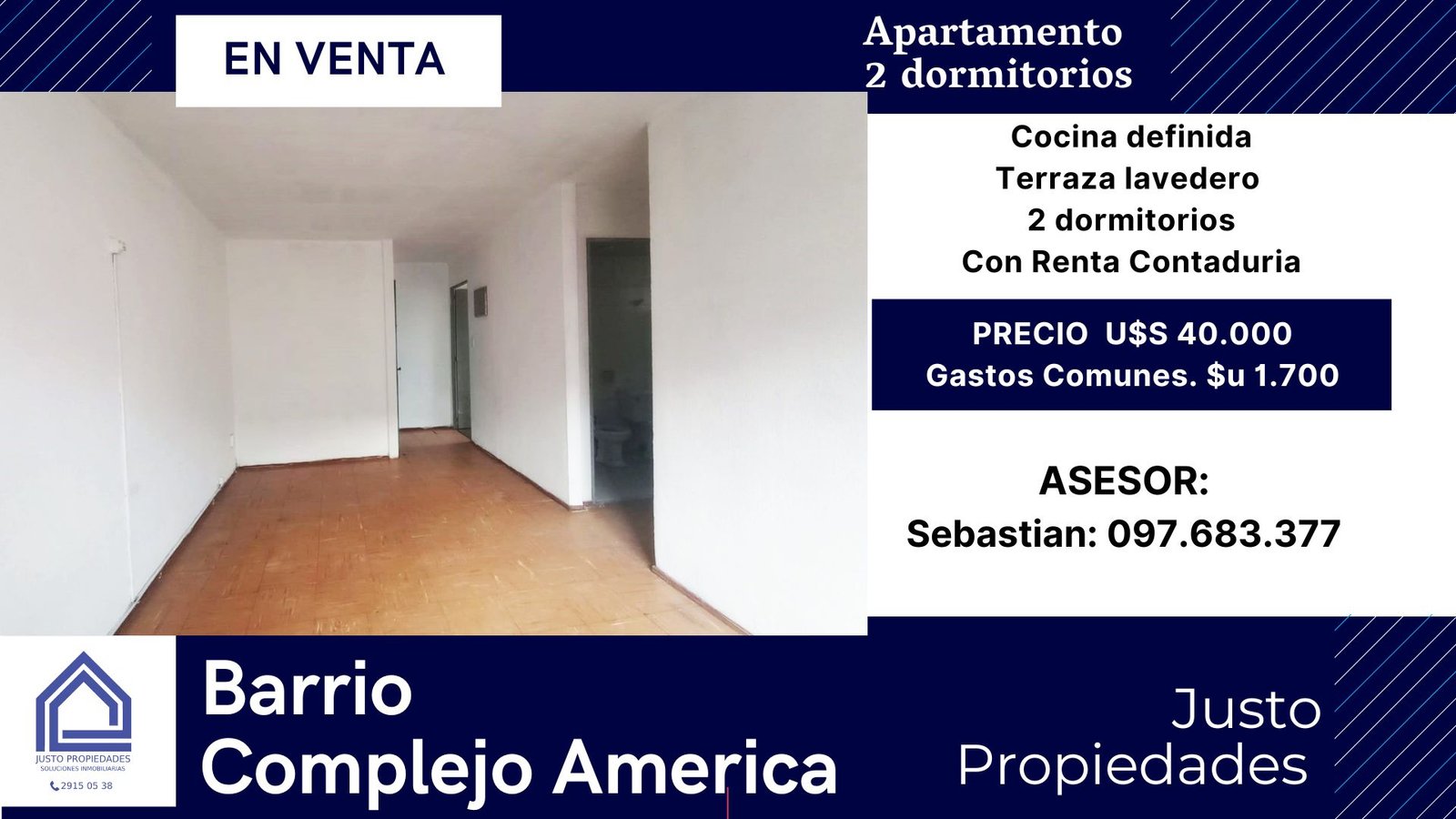 Camino Duran Complejo America Apto de dos dormitorios Segundo piso por escalera. Ingresamos por amplio living comedor con buena luz. Cocina definida con mueble aéreo y bajo mesada. Terraza lavadero con instalación para lavarropas. Dos dormitorios cómodos ambos con buena luz. Baño completo. Ubicado en el Block B, Cuenta con reja perimetral y camaras 24hs. El apto esta dentro del Complejo America, en el mismo hay una escuela, comercios de todo tipo, Espacios verdes y juegos para niños. Entorno ideal para la familia. Actualmente alquilado hasta enero 2025 Precio de Venta U$S 40.000 Gastos Comunes $u 1.700 Asesor designado Sebastian 097.683.377 Justo Propiedades Rousseau 3626 Tel. 2509.89.45 Celulares 097.683.377//098.367.958//097.552.505